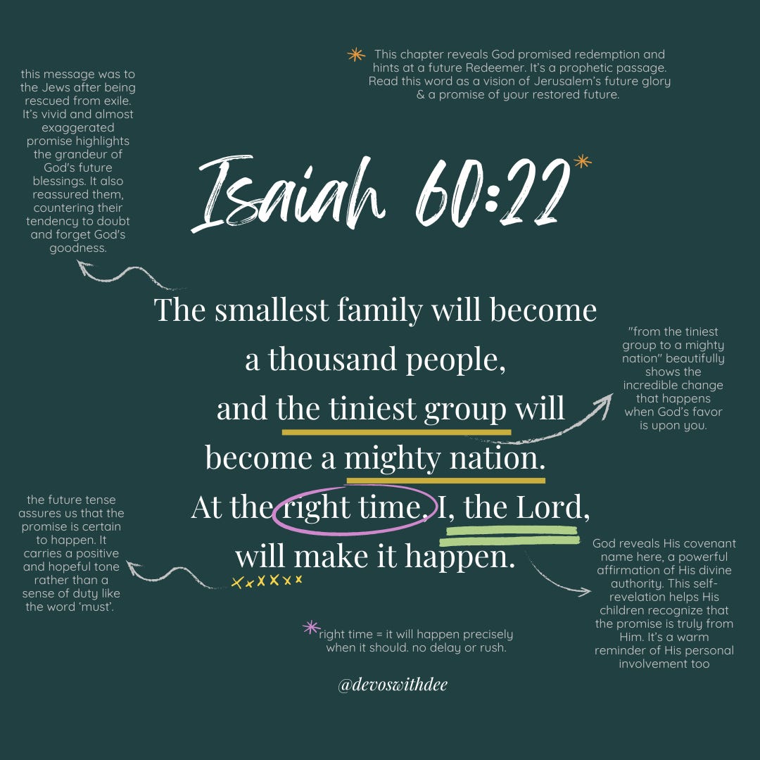 Isaiah 60:22 reveals a comforting reminder about God's grace and perfect timing. It was a gift of a promise to His children back then to strengthen their faith, reinforce His sovereignty, and affirm His faithfulness, and it's a gift to us this week.